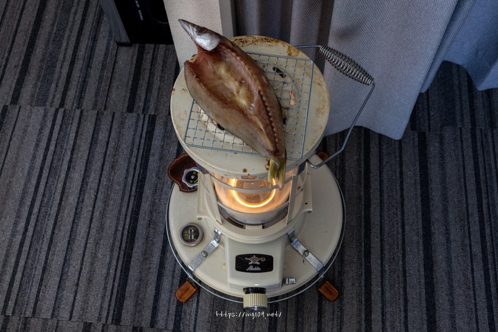 ストーブでカマスを焼きながら