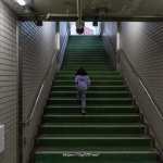 行きの階段でテンションが上がってます
